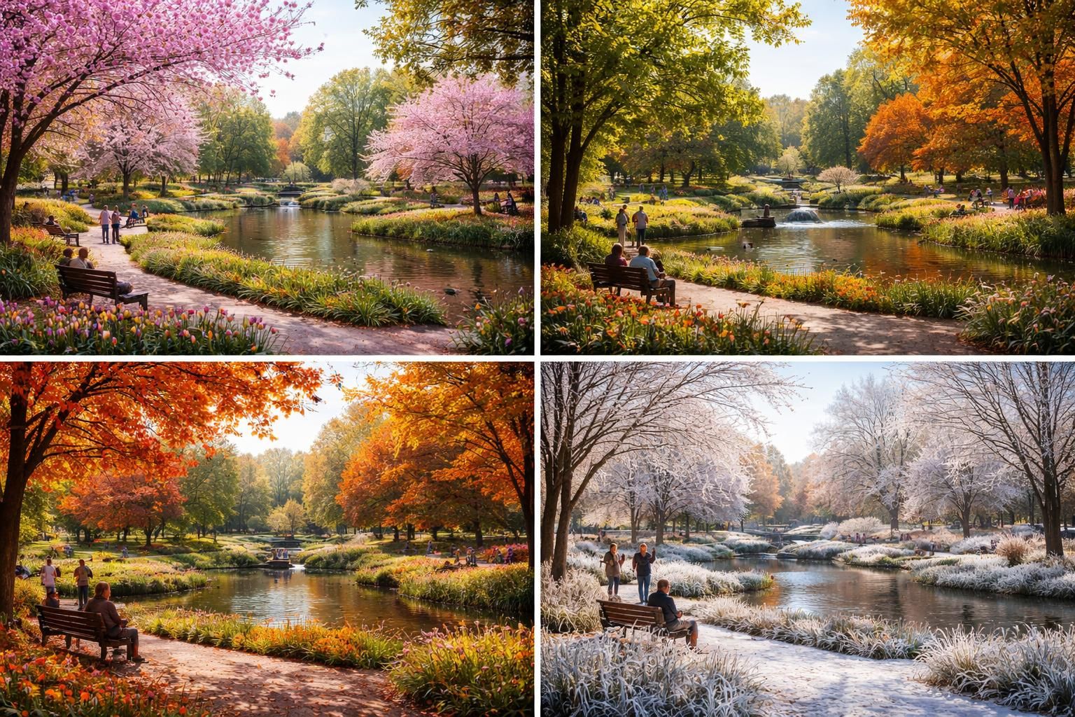 Les changements de saisons apportent des paysages uniques. Au printemps, les couleurs vives des fleurs émergentes attirent l’œil. En été, le dense feuillage offre de l’ombre et le chant des oiseaux crée une atmosphère apaisante. L’automne, quant à lui, habille le parc de teintes dorées et cuivrées, tandis que l’hiver, bien que plus discret, fait la part belle à la beauté des silhouettes dépouillées des arbres, laissant place à la magie des premiers flocons.