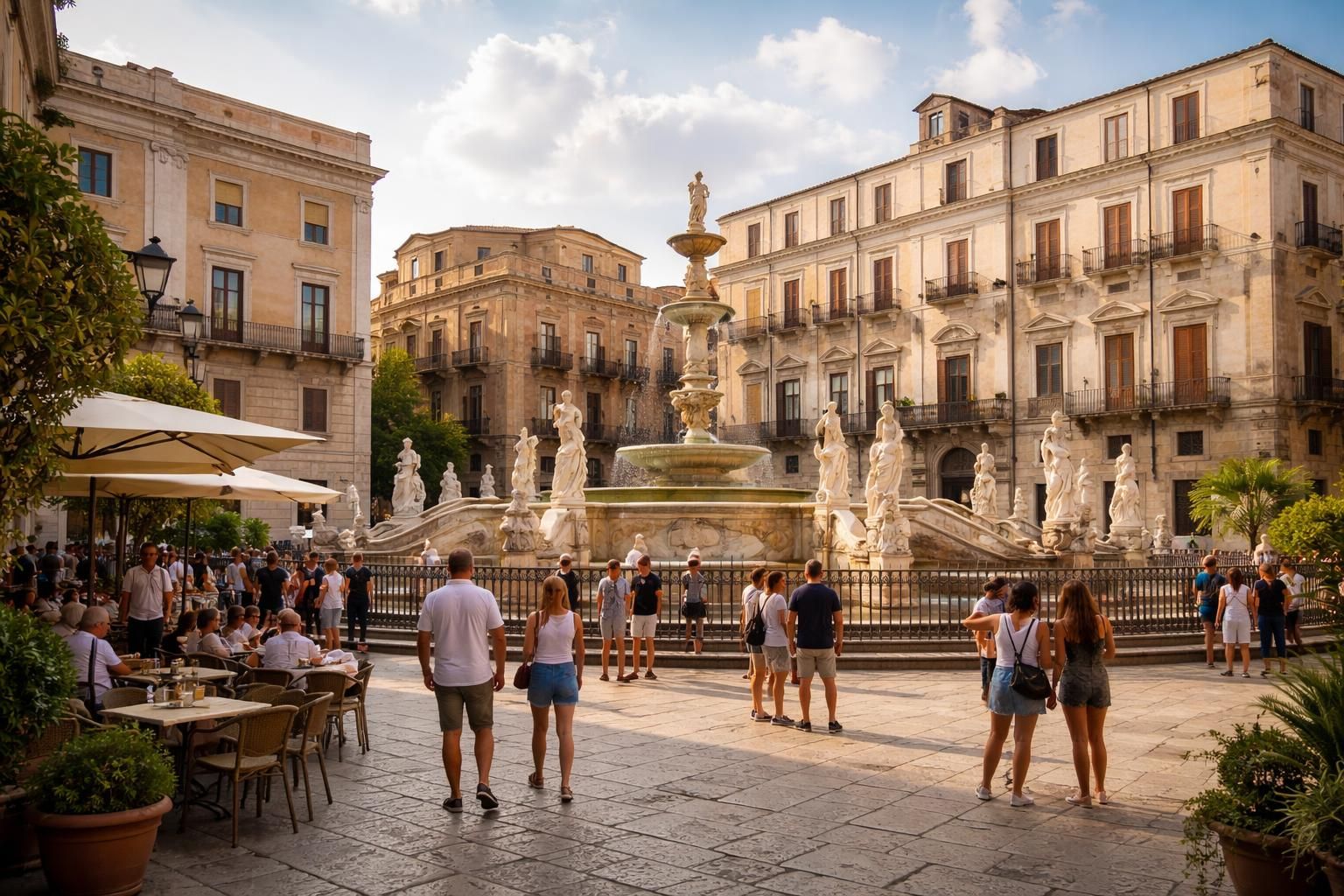 La Piazza Pretoria est entourée de bâtiments historiques représentant différents styles architecturaux. Ces édifices sont non seulement un régal pour les yeux, mais ils recèlent aussi des histoires fascinantes. Au centre de la place, la célèbre fontaine de Pretoria, érigée au XVIe siècle, déploie ses statues baroques, illustrant des mythes et des légendes. Considérée comme l’une des plus belles fontaines d’Italie, sa réalisation a débuté sous la direction de Francesco Camigliani. Ce dernier a fait appel à des artistes de renom pour les sculptures, créant ainsi une œuvre d’art à part entière.